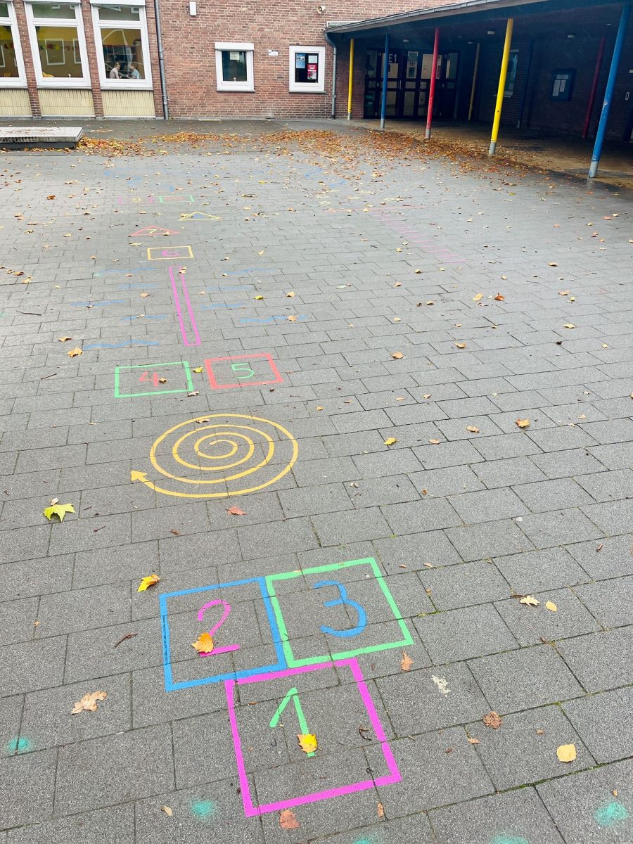 29. Oktober 2025In den vergangenen Wochen hat die Schulsozialarbeit zusammen mit engagierten Eltern den Schulhof verschönert. Mit viel Einsatz und Kreativität entstanden farbenfrohe Hüpfekästchen, die nun die Pausen noch lebendiger machen. Herzlichen Dank an alle Helferinnen und Helfer!